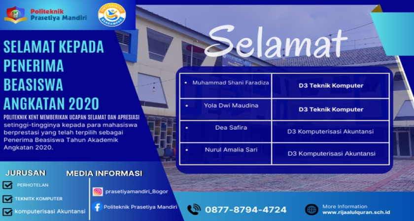 Politeknik Kent memberikan ucapan selamat dan apresiasi yang setinggi-tingginya kepada para mahasiswa berprestasi yang telah terpilih sebagai Penerima Beasiswa Tahun Akademik Angkatan 2020.