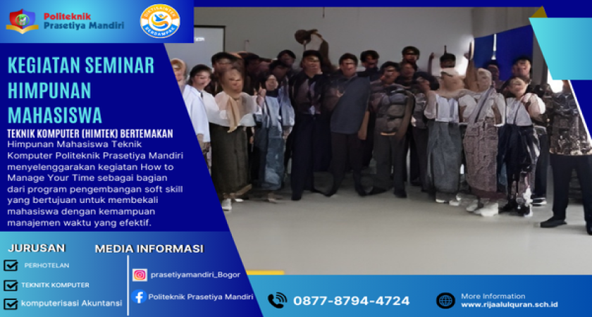 Himpunan Mahasiswa Teknik Komputer Politeknik Prasetiya Mandiri menyelenggarakan kegiatan How to Manage Your Time sebagai bagian dari program pengembangan soft skill yang bertujuan untuk membekali mahasiswa dengan kemampuan manajemen waktu yang efektif. Kegiatan ini dilatar belakangi oleh pentingnya pengelolaan waktu yang baik dalam kehidupan akademik dan non-akademik, khususnya di tengah tuntutan perkuliahan, organisasi, serta persiapan menghadapi dunia kerja yang semakin kompetitif.