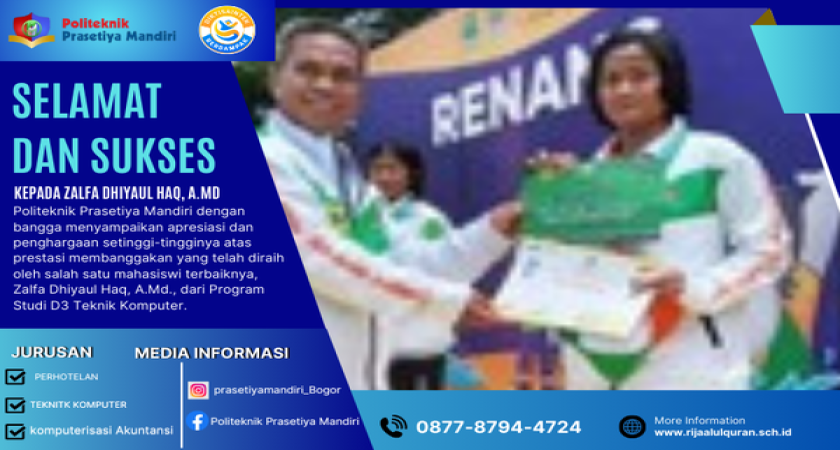 Politeknik Prasetiya Mandiri dengan bangga menyampaikan apresiasi dan penghargaan setinggi-tingginya atas prestasi membanggakan yang telah diraih oleh salah satu mahasiswi terbaiknya, Zalfa Dhiyaul Haq, A.Md., dari Program Studi D3 Teknik Komputer.